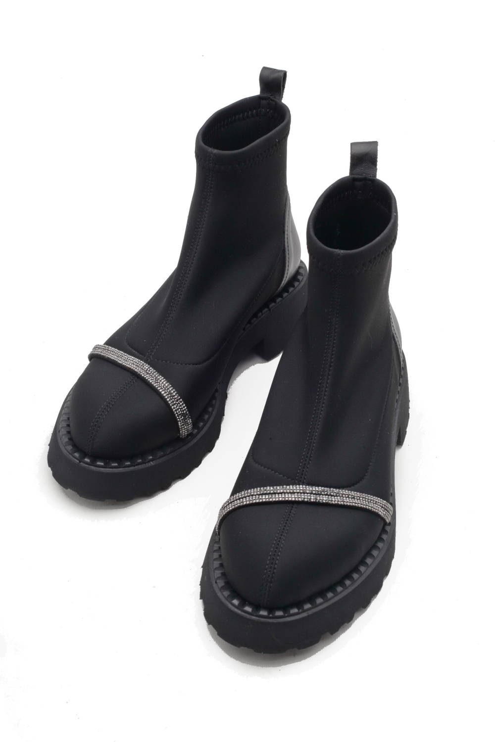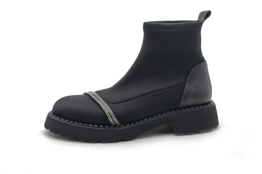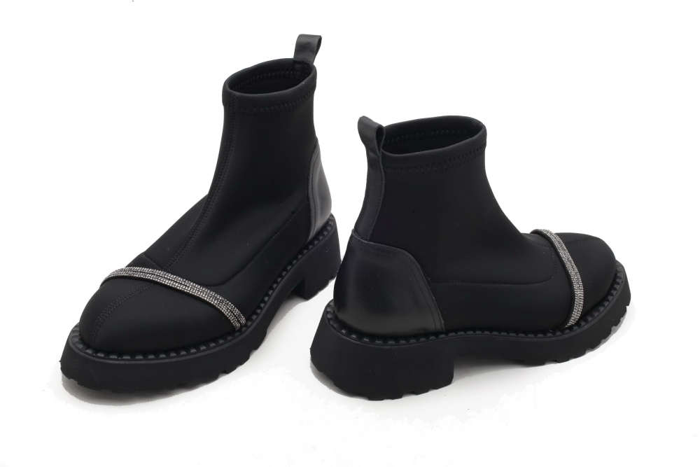 Cholewka wsuwana wykonana z rozciągliwego materiału w kolorze czarnym z delikatną ozdobą na nosku. Wnętrze nieocieplane. Spody lane, grube z obcasem o wysokości 4 cm. Do pielęgnacji zalecany impregnat doobuwia w kolorze neutralnym. Produkt włoski.