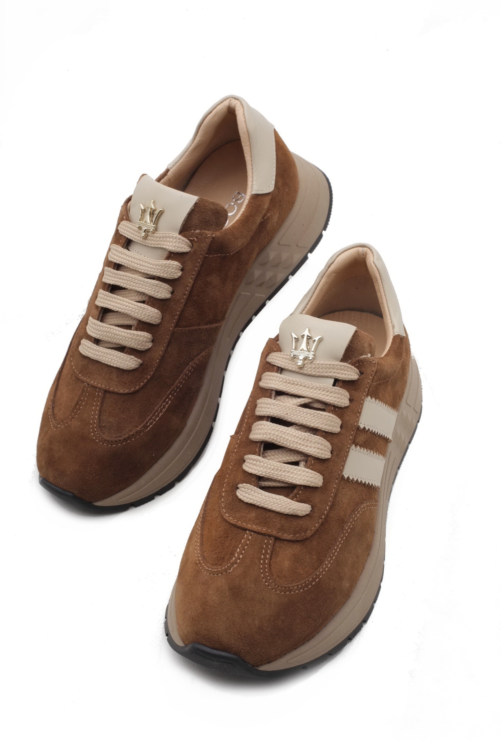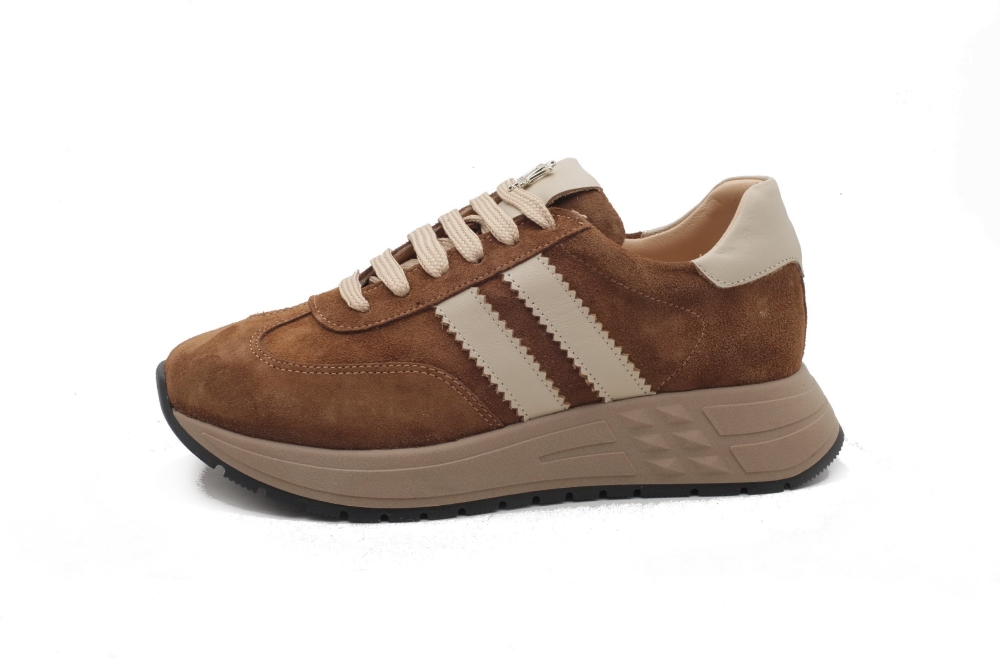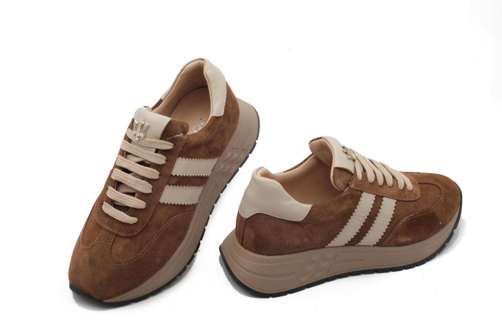 Cholewka wykonana ze skóry naturalnej zamszowej w kolorze brązowym z beżowymi dodatkami, sznurowana. Wkładka skórzana. Obuwie utrzymane w sportowym stylu. Klin o wysokości 4 cm. Do pielęgnacji zalecany impregnat do obuwia w kolorze neutralnym.