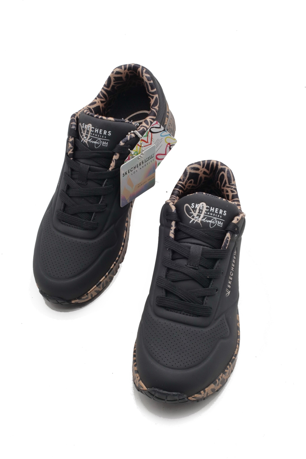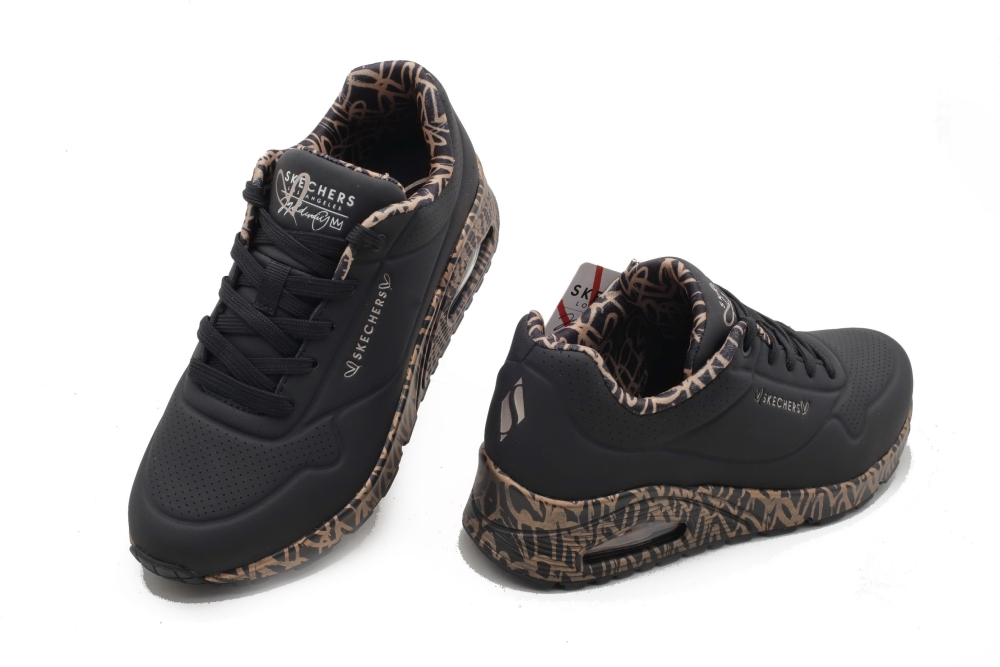 Konstrukcja Skechers Max Cushion zapewnia wyjątkowy komfort,posiada oddychającą wkładkę Skechers Air-Cooled Goga Mat z amortyzacją. Obuwie wykonane jestw 100% z wegańskichmateriałów. Model sznurowany w kolorze czarnym ze złoto- brązowymi dodatkami; elastyczna, lekka i przyczepna podeszwa. Wysokość spodu4 cm.
