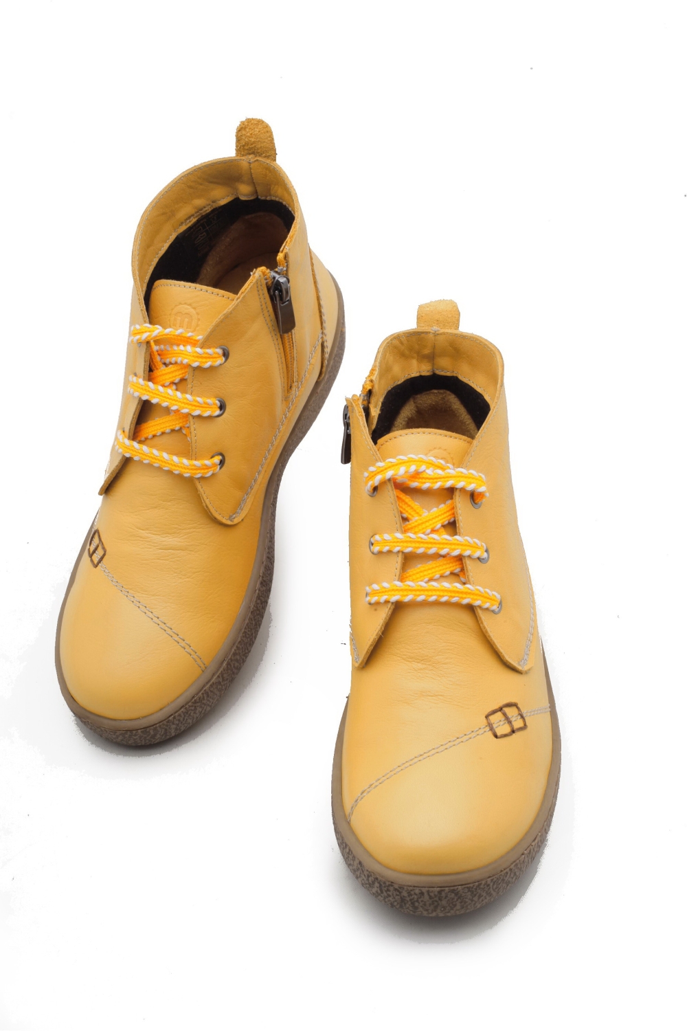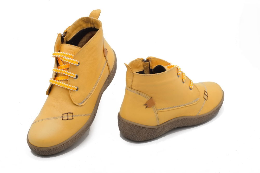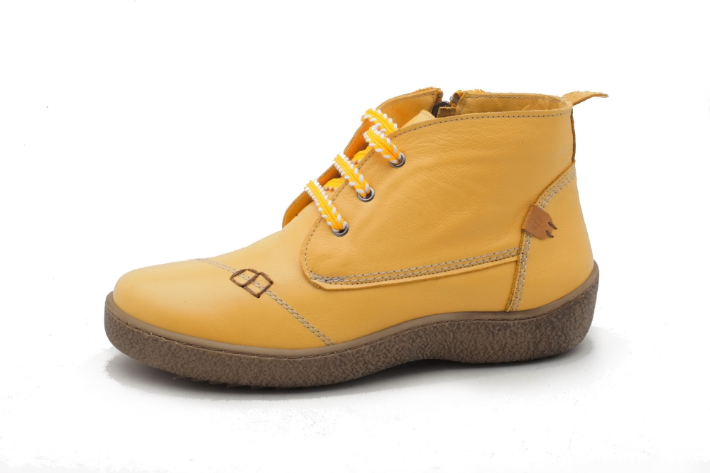 Cholewka wykonana ze skóry naturalnej w kolorze żółtym, sznurowana oraz zapinana na zamek. Wnętrze wyłożone miękką pianką, wkładka skórzana. Na cholewce przeszycia białą nicią. Nosek zaokrąglony, spody antypoślizgowe. Do pielęgnacji zalecany krem do skór delikatnych w żelu. Produkt niemiecki.
