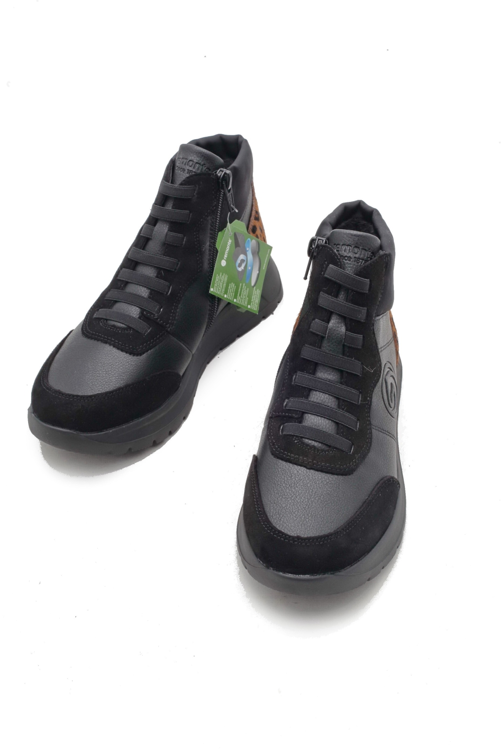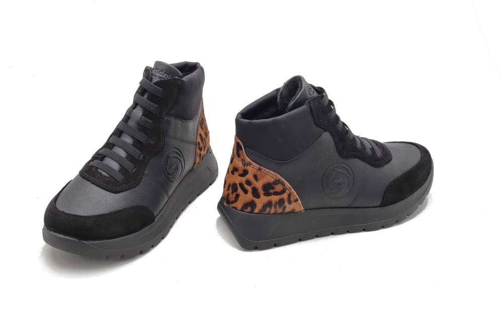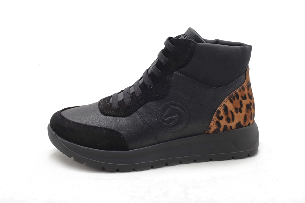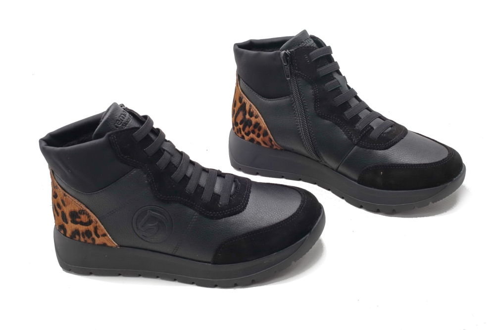Cholewka w kolorze czarnym, sznurowana i zapinana na zamek, łączenie skóry naturalnej z ekologiczną. Obuwie posiada bardzo elastyczną podeszwę. Do pielęgnacji zalecany preparat do obuwia "4 in 1". Produkt niemiecko- szwajcarskiej firmy Rieker Antistress, linia Remonte.