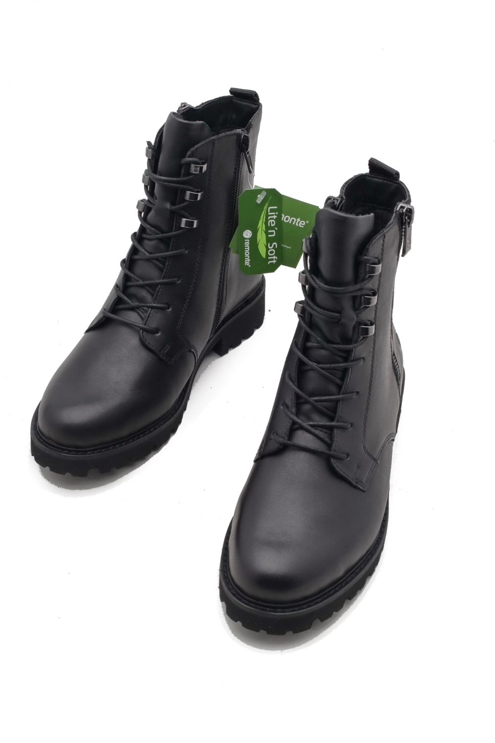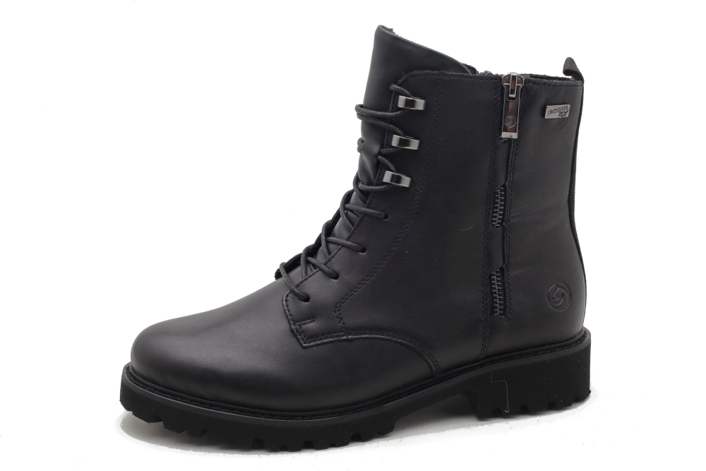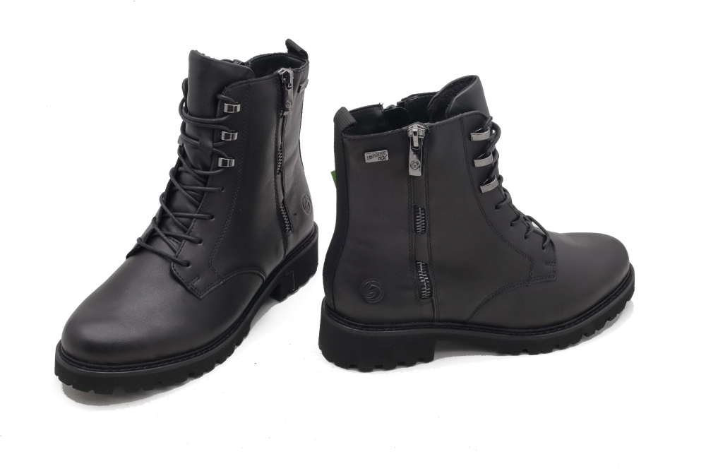 Cholewka wykonana ze skóry naturalnejw kolorzeczarnymzapinana na zamek i sznurowana. Obuwie ocieplone miękkim futerkiem. Spody grube, lane, antypoślizgowe w kolorze czarnym. Do pielęgnacji zalecanytłuszczdo skórw kolorze neutralnym. Produkt niemiecko- szwajcarskiej firmy Rieker Antistress, linia REMONTE.