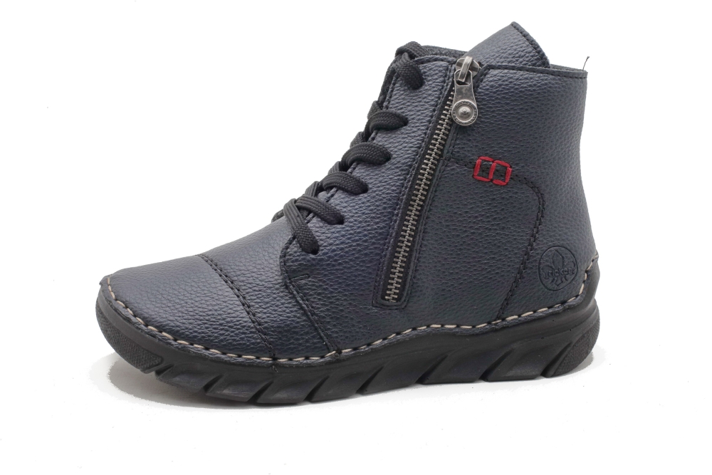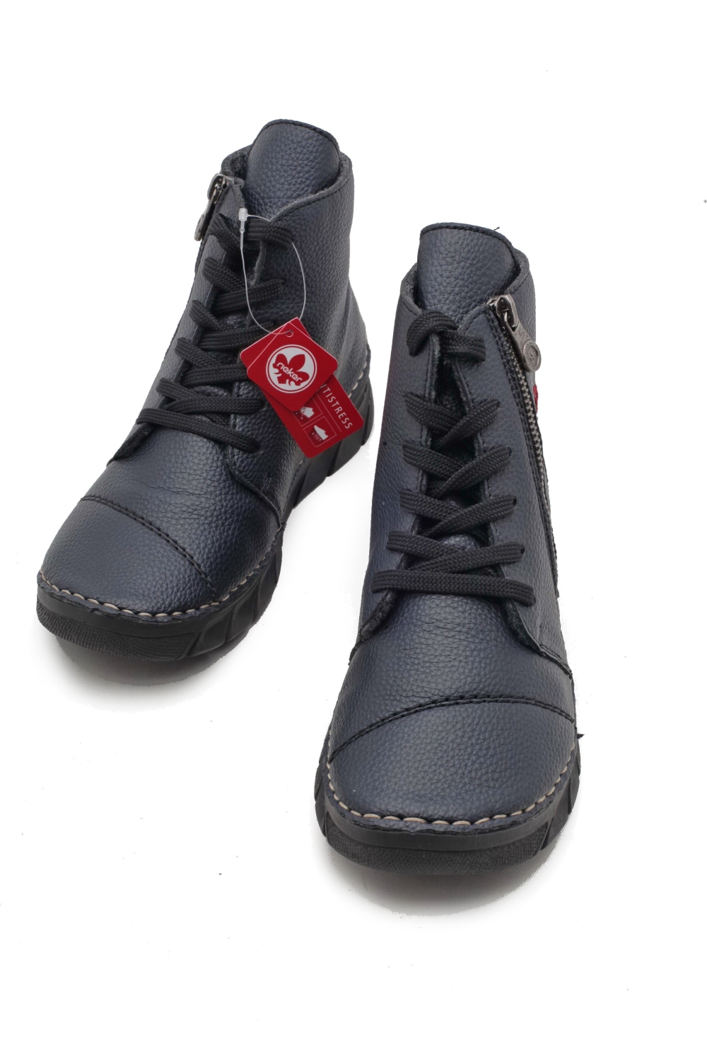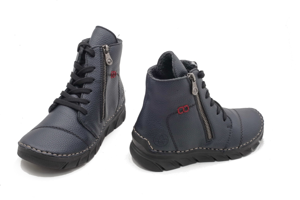 Cholewkaw kolorze granatowym. Obuwie sznurowane i zapinane na zamek od strony zewnętrznej. Cholewka przeszywana. Spód antypoślizgowy w kolorze czarnym.Do konserwacji zalecanytłuszcz do obuwia w kolorze bezbarwnym. Produkt niemiecko-szwajcarskiej firmy Rieker-Antistress.