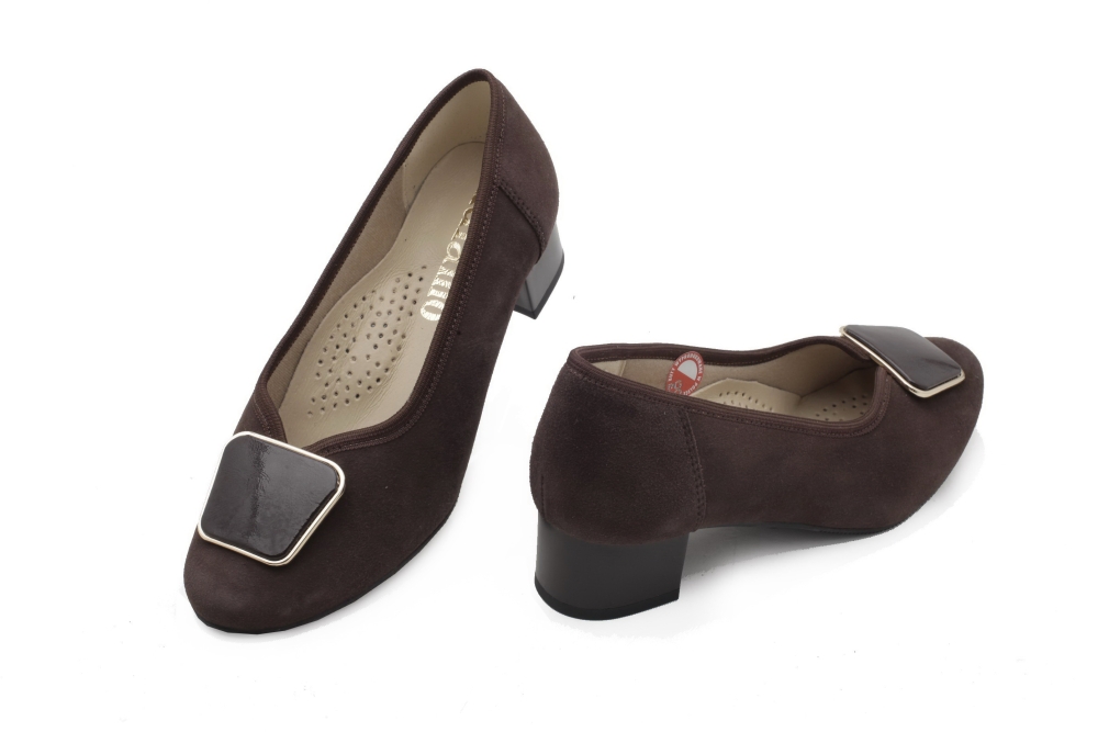 Cholewka wykonana ze skóry naturalnej zamszowej w kolorze czekoladowym, Wnętrze wyłożone miękkim laminatem. Wkładka skórzana, profilowana. Obcas nieobleczony skórą o wysokości 4 cm. Na nosku ozdoba ze złotym wykończeniem. Do pielęgnacji zalecany impregnat do obuwia w kolorze neutralnym. Produkt polski.
