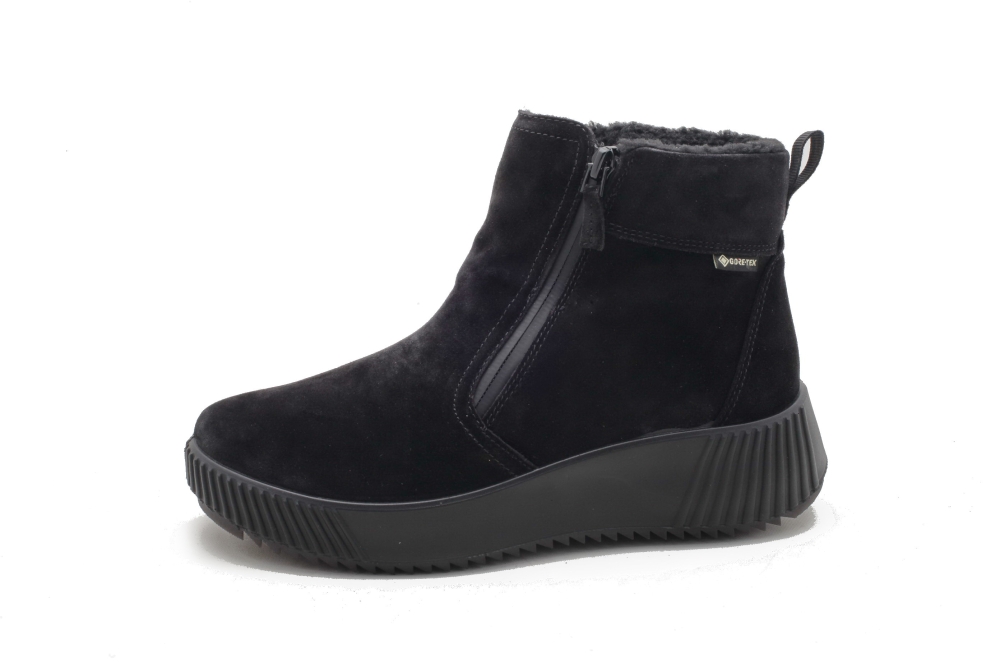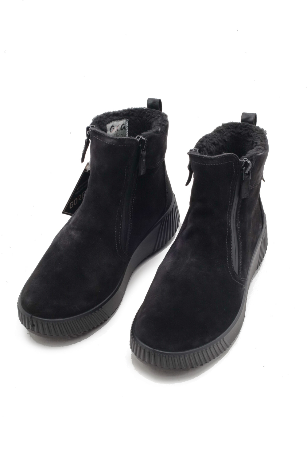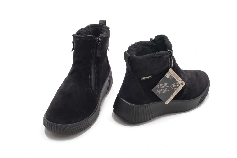 Cholewka wykonana ze skóry naturalnej zamszowej w kolorze czarnym, wnętrze wyłożone miękkim futerkiem. Wyjmowana miękka wkładka zapewnia komfort użytkowania. Obuwie zapinane na dwa zamki, spody grubsze antypoślizgowe. Tęgość H. Do pielęgnacji zalecanyimpregnat do skór w kolorze neutralnym. Obuwie niemieckie.