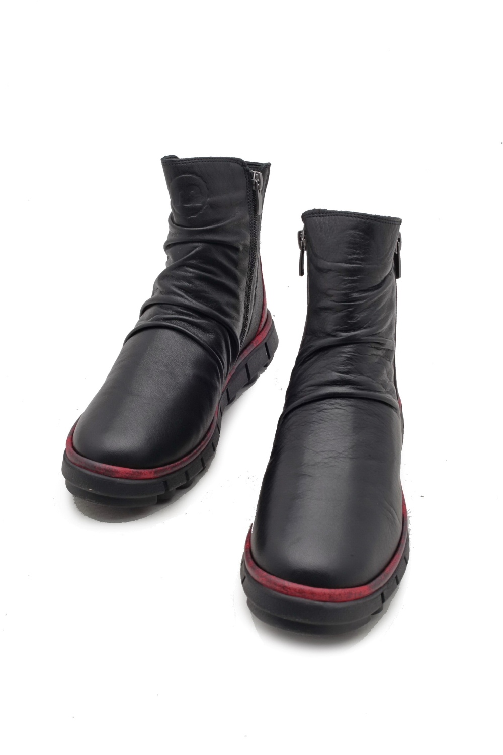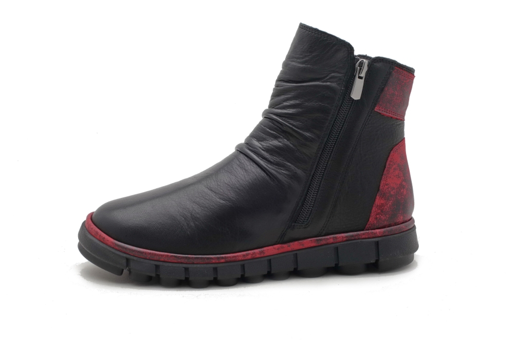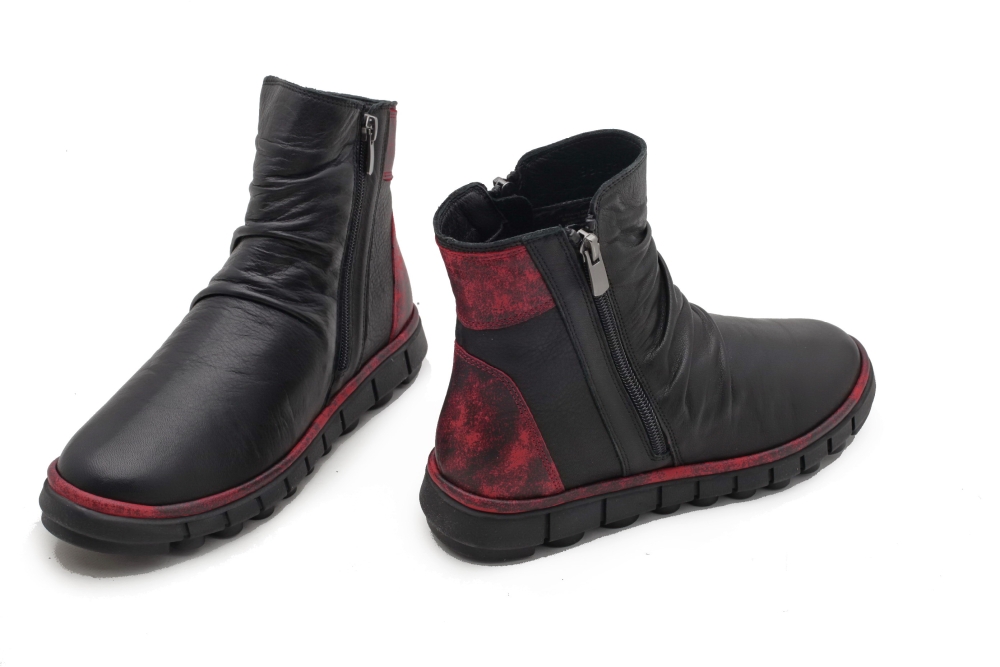 Cholewka wykonana ze skóry naturalnej w kolorze czarnym, w pięcie wszytaczerwona skóra. Wnętrze ocieplone delikatnym polarem. Spody grubsze, antypoślizgowe. Zamek od strony wewnętrznej i zewnętrznej. Napodbiciu ozdobne marszczenie. Do pielęgnacji zalecany tłuszcz do skórw kolorze neutralnym. Produkt niemiecki.