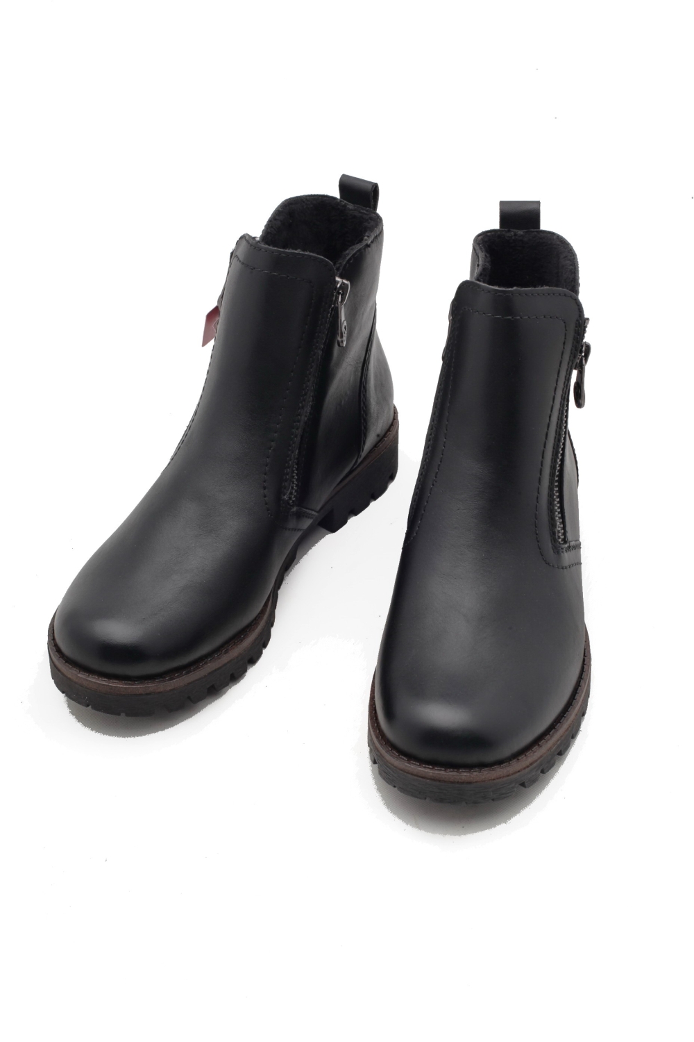 Cholewka wykonana ze skóry naturalnej w kolorze czarnym, wnętrze ocieplone delikatnym polarem. Po obu stronach zamki ułatwiające zakładanie obuwia. Spody grube, antypoślizgowe. Do pielęgnacji zalecany tłuszcz do skór w kolorze neutralnym. Produkt niemiecko- szwajcarskiej firmy Rieker Antistress.
