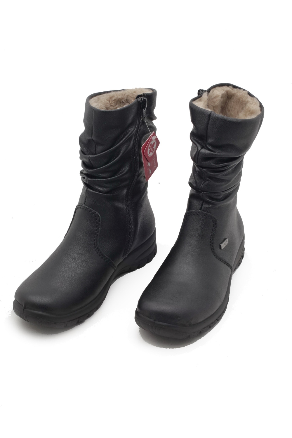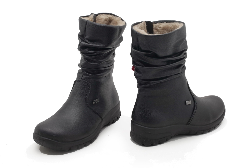 Botki wykonane ze skóry naturalnejlicowej w kolorze czarnym. Wnętrze naturalne ocieplenie. Cholewka zapina na na zamek. Obuwie z systemem zabezpieczającym przed przemakaniem Rieker TEX. Do konserwacji zalecany preparat do skór naturalnych obuwia lub neutralnym oraz impregnat do obuwia. Produkt niemiecko-szwajcarskiej firmy Rieker Antistress.