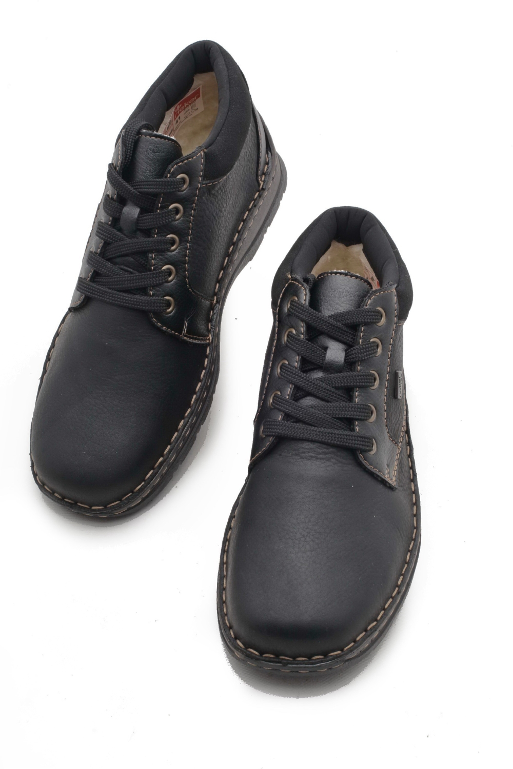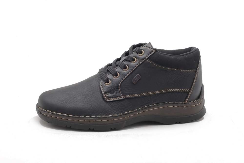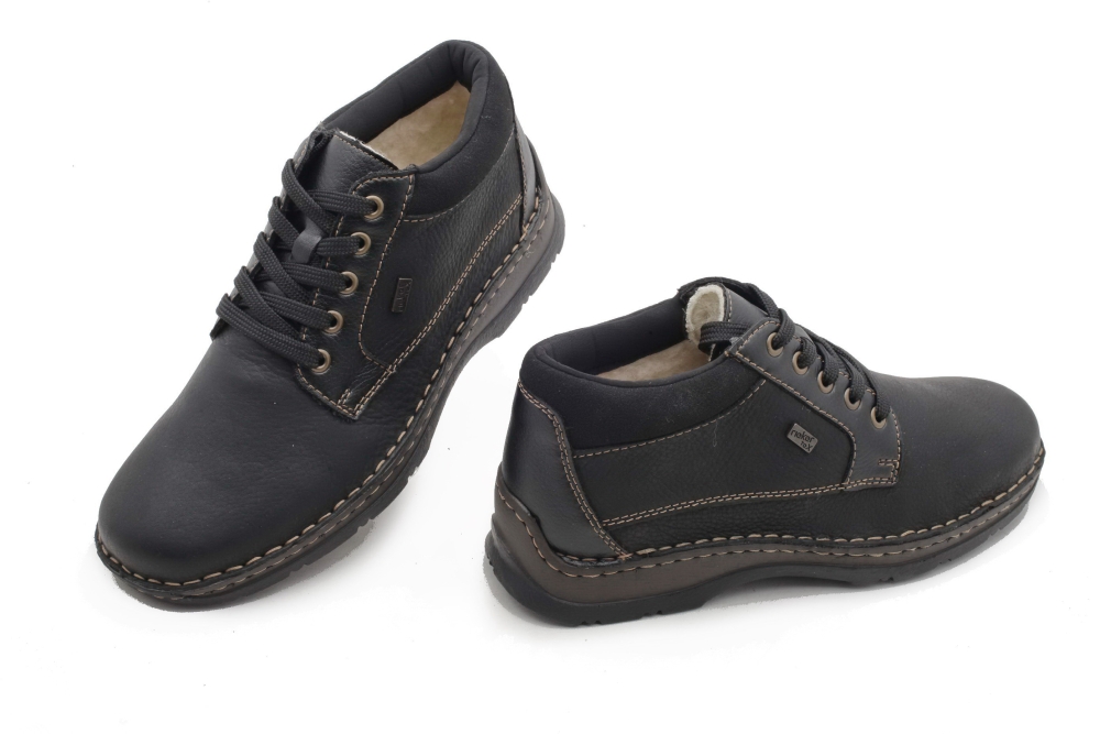 Wierzch skóra naturalna groszkowana w kolorze czarnym, z systemem zabezpieczającym przed przemakaniem RiekerTEX. Wnętrze- naturalna owcza wełna.Obuwie sznurowane.Do konserwacji najlepiej używać preparatów do skór naturalnych w kolorze obuwia lub neutralnym. Obuwie niemiecko-szwajcarskiej firmyRieker Antistress.