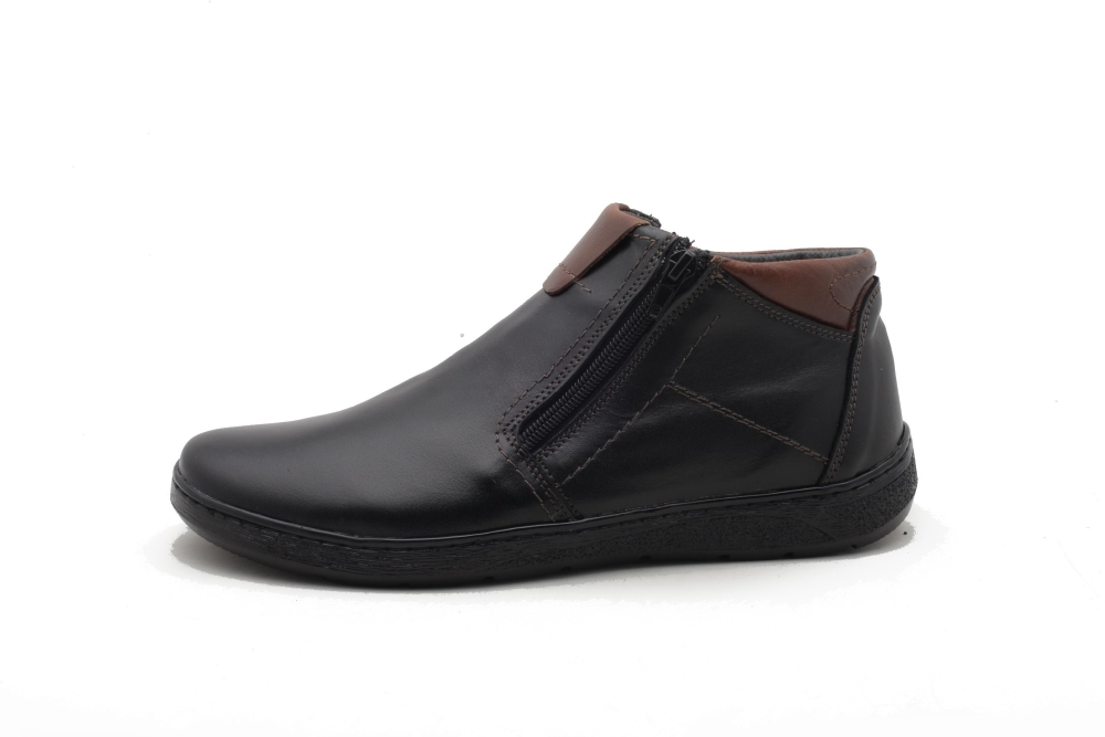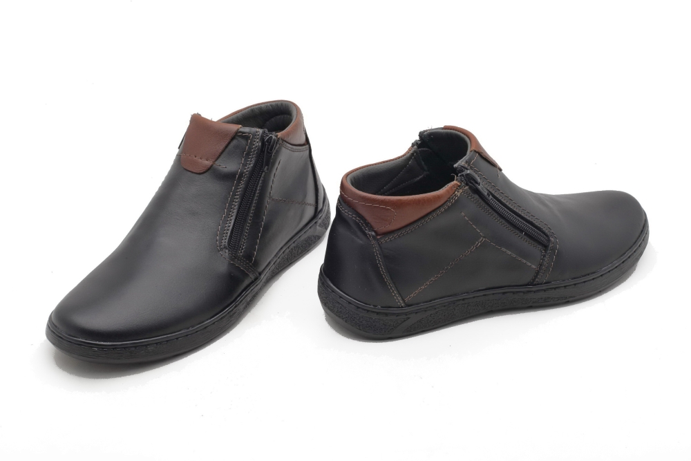 Cholewka wykonana ze skóry naturalnej w kolorze czarnym z brązowymi dodatkami przy kostce. Wnętrze delikatnie ocieplone. Obuwie zapinane na dwa zamki. Cholewka gładka. Spody antypoślizgowe. Do pielęgnacji zalecany tłuszcz do skór w kolorze neutralnym. Produkt polski.